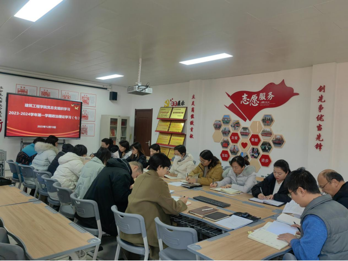 2023年12月19日下午,建筑工程学院党总支在郑州校区办公楼516党员活动室(开封校区C202)组织开展政治理论学习活动。本次学习采取东西校区视频连线,线上、线下相结合的方式,会议由建筑工程学院党总支书记张虎主持,院长李勇及全体教职工参加。