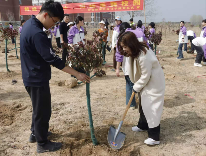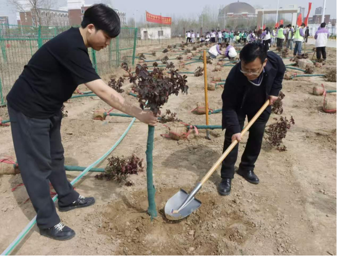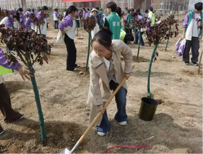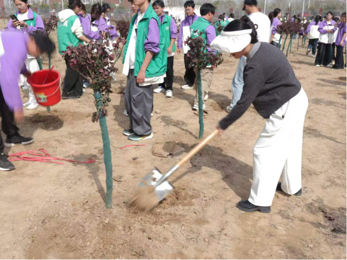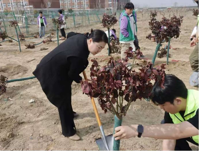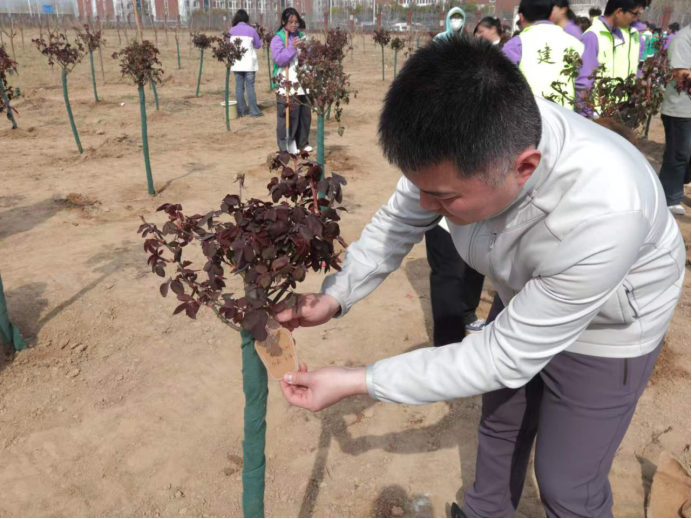 活动现场,在党总支书记宁晓冬强调此次植树活动意义后,大家迅速投入到植树工作中。党员教师们率先垂范,与入党积极分子们分工协作、配合默契。挥锹铲土、扶苗培土、提水浇灌,每一道工序都认真细致、一丝不苟。老党员带头挥锹,青年师生紧随其后,现场气氛热烈而有序。经过大家的齐心协力,一株株独杆月季稳稳扎根、迎风挺立,汇聚成一片充满生机的“党员先锋林”,为春日校园增添了一道亮丽的风景线。