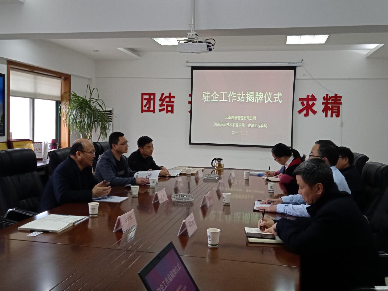 为进一步深化校企合作,加强双师教师培养、推进专业群建设及“三教”改革,培养合格专业技能人才。建筑工程学院院长张虎、办公室主任樊磊、教务办主任任旭凯、就业专员宋春磊等一行4人,在3月10日上午来到河南元森建设管理有限公司,出席驻企工作站签约及挂牌仪式,并参加深化校企合作产教融合研讨会。河南元森建设管理有限公司董事长李威、副总经理范建伟、赵文义、人事部经理李燕飞等企业领导出席。
