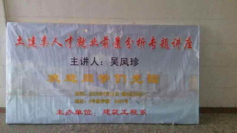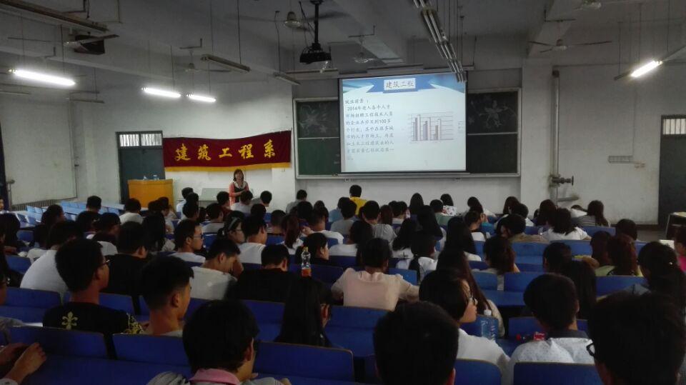 2015年5月13日为了丰富我系学生的课外生活,拓展同学们的专业知识以及所要从事专业岗位的认知,建筑工程系在B501教室特举办《土建从业人员就业前景分析》专题讲座,旨在提高大学生的就业能力,对当前就业前景以及择业、就业的重要性有一个全面的认识,树立一个正确的就业观和择业观。