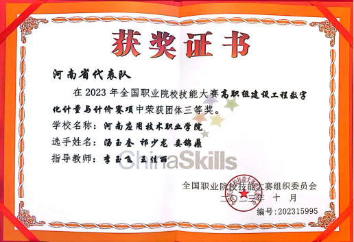 2023年10月28日,由教育部等36个部门主办的2023年全国职业院校技能大赛高职组“建设工程数字化计量与计价”赛项在青海建筑职业技术学院举行,来自全国32个省、市、自治区的76支代表队参与角逐,经过激烈比拼,beat365建筑工程学院学生汤玉奎、祁少龙、娄锦鼎组成的代表队荣获全国团体三等奖。