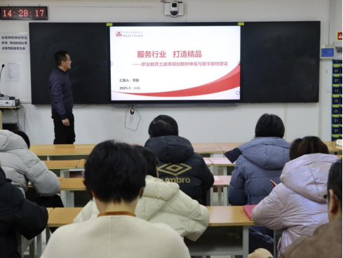 会议最后,学院邀请中国建筑工业出版社李阳主任开展“服务行业,打造精品——职业教育土建类规划教材申报与数字教材建设”主题讲座。他深入分析了当前职业教育土建类教材的现状与挑战,并强调了规划教材申报的重要性与流程。