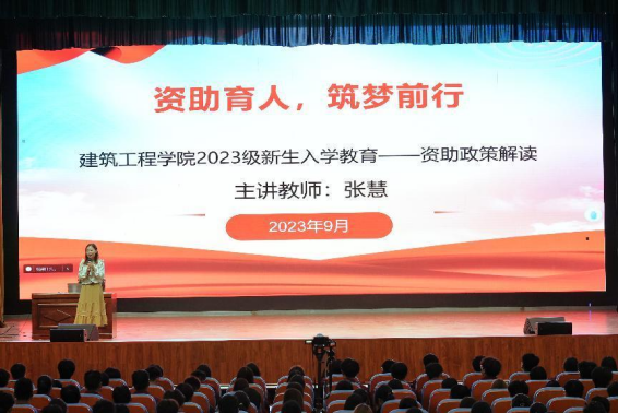 为进一步加大学生资助政策宣传力度,使国家学生资助政策深入人心,提升学院资助育人的成效,2023年9月27日,建筑工程学院召开新生入学教育之资助政策解读类,会议由资助专员张慧老师主讲,全体2023级新生参加会议。