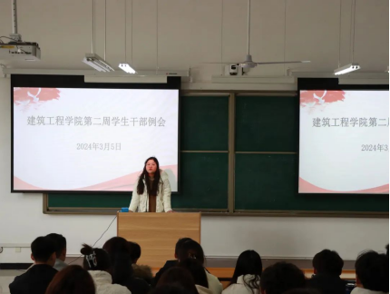 为进一步提升学生干部的思想政治觉悟,加强学生干部队伍建设,打造一支思想政治素质硬、管理水平高、业务能力强的学生干部队伍,建筑工程学院于2024年3月5日在开封校区A101教室(郑州校区B101教室)组织召开第二周学生干部专题培训。会议由建筑工程学院学工办主任史真主持,团总支书记王莹、辅导员罗斐、宋雅雯,以及全体22级、23级学生会成员、班长、副班长、团支书参加。