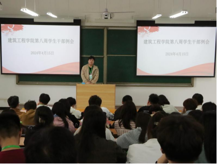 为进一步加强学生干部队伍建设,提高学生自我服务、自我管理、自我教育、自我监督的意识和能力,增进各部门之间的交流,提高工作水平,建筑工程学院于2024年4月15日在开封校区A101教室组织召开第八周学生干部例会。会议由建筑工程学院学工办主任史真主持,全体学生会成员以及各班班长、副班长、团支书参加。
