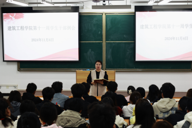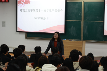 2024年11月4日,建筑工程学院于开封校区D101教室组织召开第十一周学生干部例会。此次例会旨在总结过往工作经验,明晰未来发展方向,全面提升学生干部的综合素质与工作能力。会议由建筑工程学院团总支书记王莹主持,学工办主任史真、部分辅导员、各班班长、团支书、各部门部长以及 24 级学生会成员共同参与。
