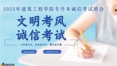 为扎实推进2025年专升本考试筹备工作,深度落实考风考纪建设,全方位提升学生诚信应考的思想认知,全力营造诚信为本的校园风气,保障每一位考生在公平、公正的环境中顺利参考,建筑工程学院精心组织并开展了专升本考生诚信考试教育主题班会。
