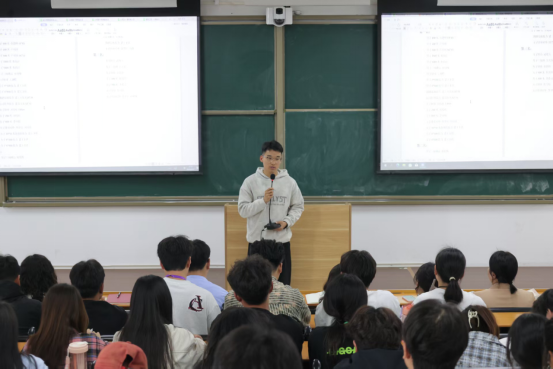 随后,王莹围绕团队凝聚力与学生会换届交接展开讲述。她指出凝聚力是团队高效运转的核心纽带,需要靠团结协作让集体智慧在服务同学与活动策划中充分释放。她谈到换届交接最重要的是责任意识、创新思维与团队精神的传承,呼吁23级干部做好“传帮带”,以经验助力成长,让24级同学更快融入,共同推动学生会工作再上新台阶。