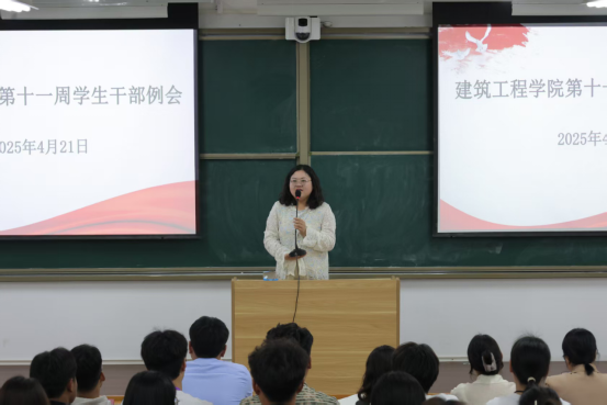 为明确学生干部工作方向与目标,增强团队凝聚力,促进学生干部全面发展,推动学院学生工作高质量提升。2025年4月21日,建筑工程学院于开封北院D101教室召开第十一周学生干部例会。会议由学工办主任史真主持,团总支书记王莹、辅导员宋雅雯、陈静静、尹宇龙、李希望,以及主席团、各部门部长、各班班长、团支书、各部门代表参与。