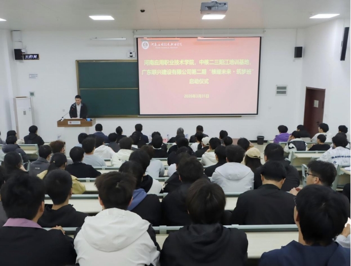 为深化产教融合、校企合作,精准对接核电建设领域人才需求,2026年3月31日,河南应用职业技术学院beat365官方网站联合中核二三阳江培训基地、广东联兴建设有限公司举行第二期“核耀未来・筑梦班”启动仪式。中核二三阳江培训基地校长张泰方、广东联兴建设有限公司华中区域招聘总监王中良莅临现场,党总支书记宁晓冬、副书记张蓄金出席会议,党政办主任李慧杰、教研室主任冯娇伟及教师代表参加会议,会议由宁晓冬主持。