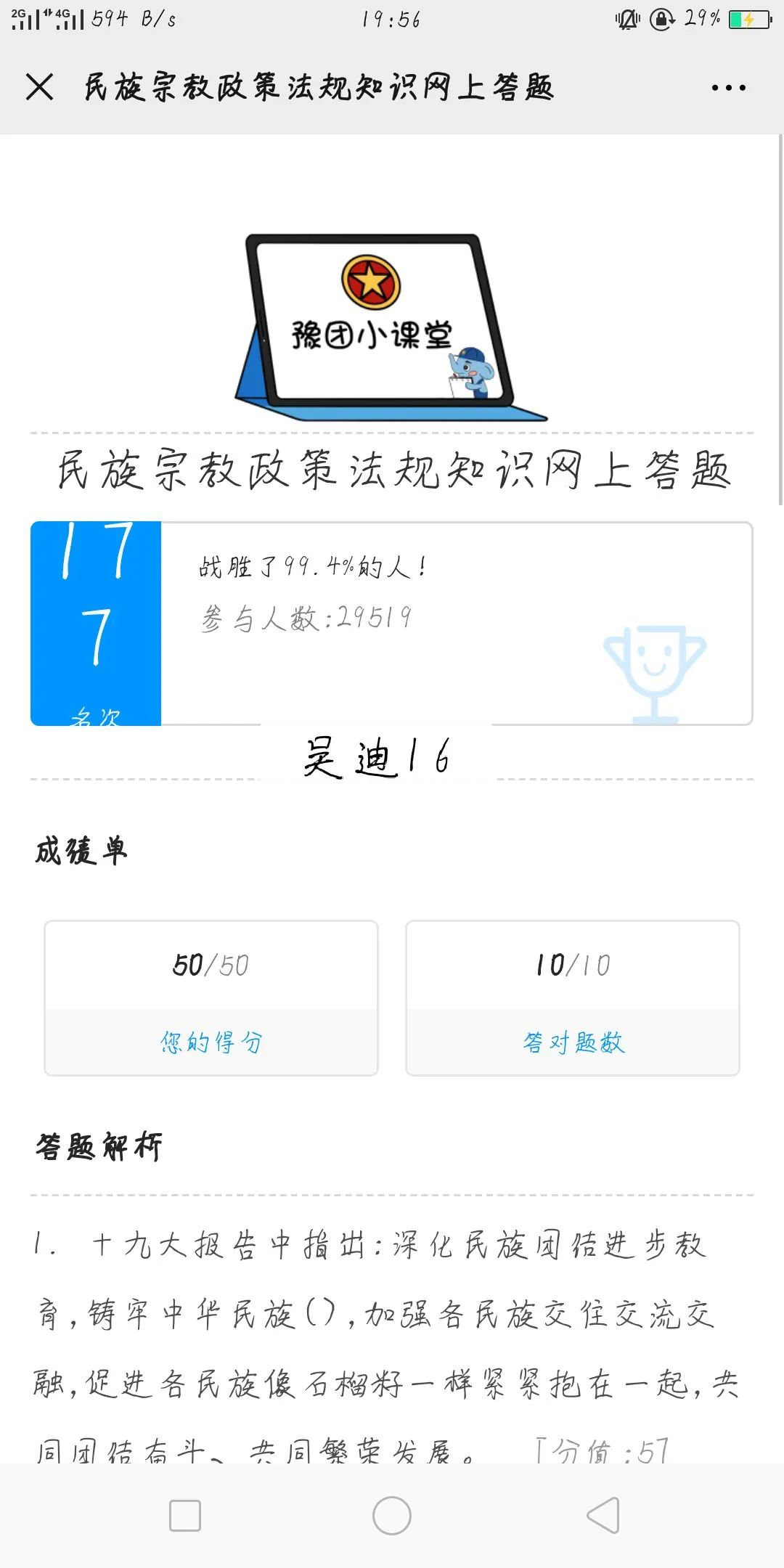 为普及宗教知识,加强马克思主义宗教观教育,建筑工程学院响应上级号召,于2020年9月12日-21日,建筑工程学院组织全体学生积极开展民族宗教政策法规知识网络答题活动。
