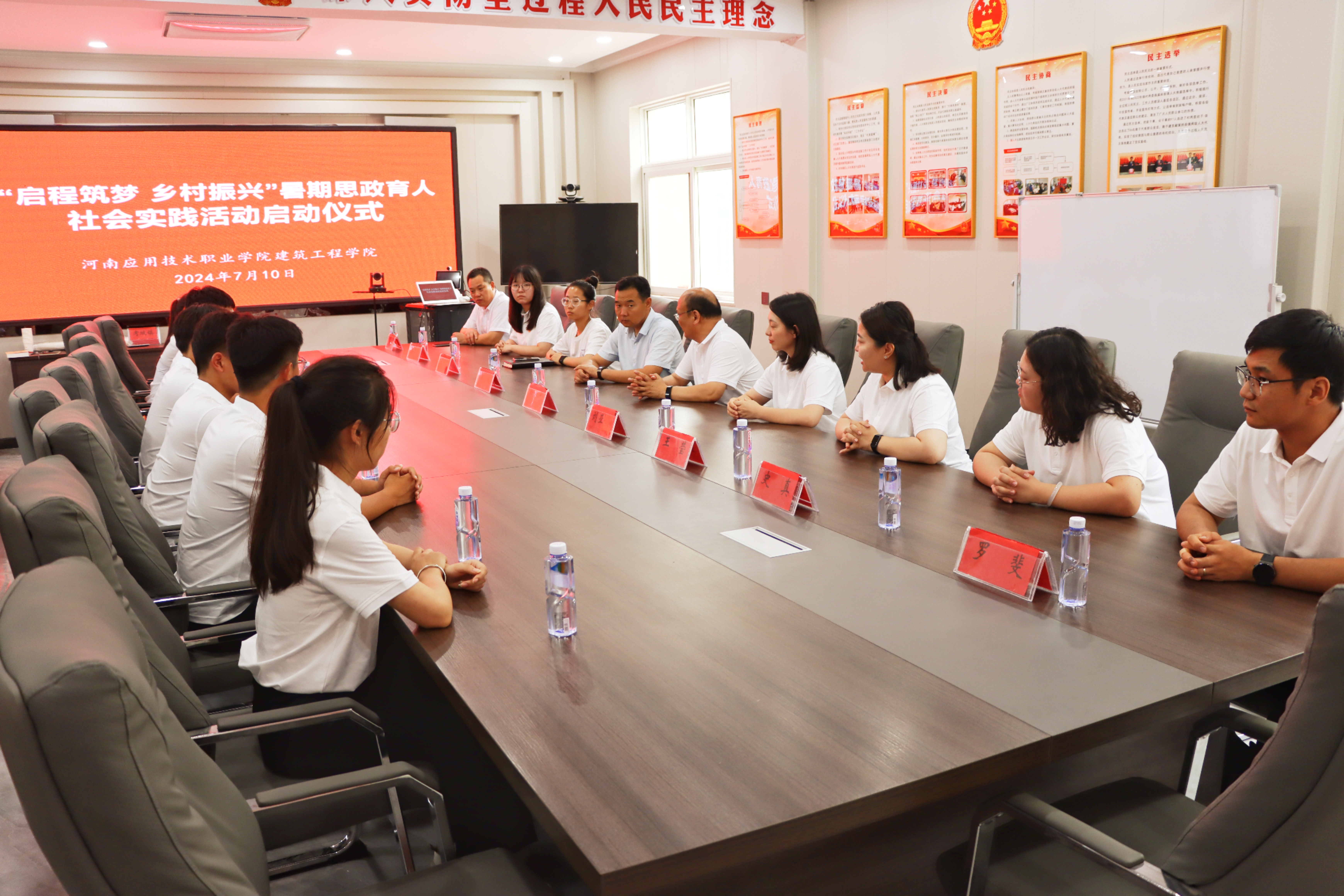 为深入学习贯彻党的二十大精神,教育引导广大青年学子在实践中增强责任感和使命感,让同学们亲身感受新时代农村建设成果,河南应用技术职业学院建筑工程学院“启程筑梦 润心教育”社会实践团于7月10日到达兰考县考城镇举行2024年暑假“三下乡”社会实践活动启动仪式,本次会议由考城镇团委书记王景焕主持,考城镇镇长李良、建筑工程学院党总支书记张虎、副书记刘亚娟、团总支书记王莹、学工办主任史真、辅导员罗斐、教师代表李雪萌及学生李文涵等团队成员参会。