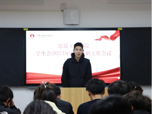 为总结回顾2023年学院学生会工作情况,夯实学生会改革成效,加强学院学生会人员工作能力建设,增强学生会的凝聚力,保证学院学生会各项工作落实到位,建筑工程学院于2024年1月4日组织开展学生会2023年部门述职工作会议。此次会议由建筑工程学院学工办主任史真主持,辅导员赵影以及学生会主席团、各部门部长、副部长参加。