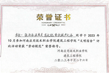 2024年01月,获得河南应用技术职业学院优秀文明宿舍