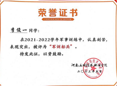 2023年05月,获得河南应用技术职业学院2023年度军训标兵