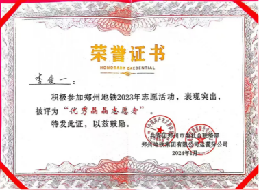 2024年1月13日,获得郑州市地铁“优秀晶晶志愿者”