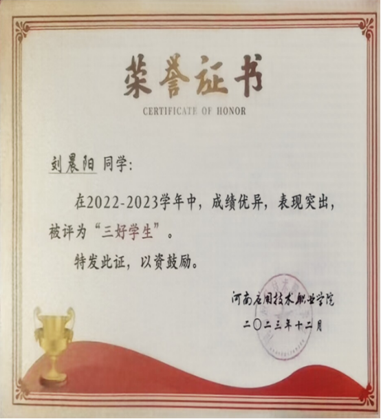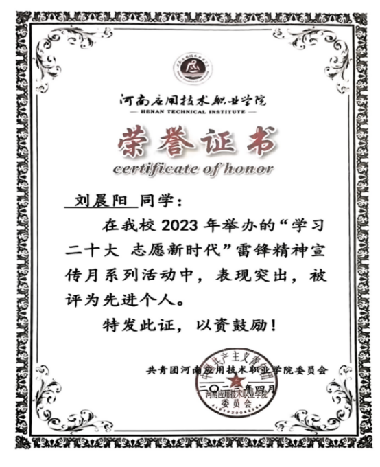 曾荣获“国家专利2项”、“国家励志奖学金”、校级“三好学生”、河南应用技术职业学院“学习二十大 志愿新时代”雷锋精神宣传月系列活动中先进个人等荣誉。