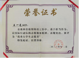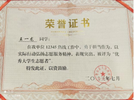 2023年7月 参与“大学生返家乡”志愿活动荣获县级“优秀大学生志愿者”荣誉称号