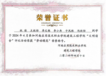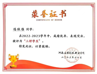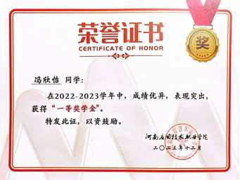 冯欣怡,女,汉族,中共预备党员,河南应用技术职业学院建筑工程学院2022级建筑室内设计专业2班团支书,2022-2024学年全学院成绩加权平均成绩第二,专业排名第二。在校期间学习成绩优异、积极参加各类活动及比赛。曾荣获校级一等奖学金、三好学生等荣誉。
