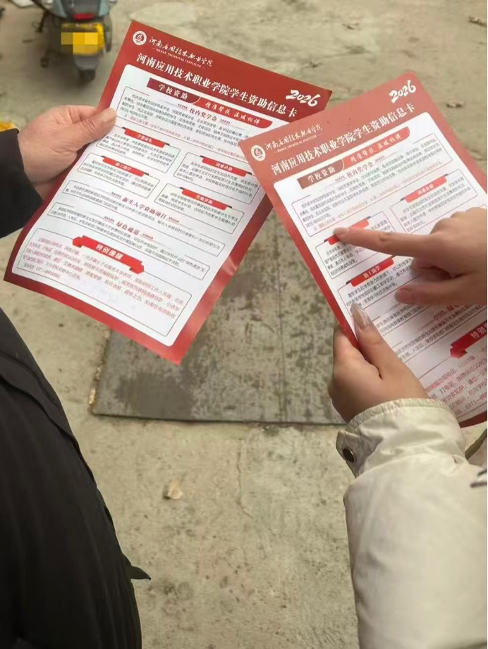 2026年2月10日,我回到古城乡开展资助宣传活动。以“不让一个学生因家庭经济困难而失学”为主题,面向村内有子女即将升学或正在就读的农户家庭。我紧扣《河南应用技术职业学院学生资助信息卡》,系统介绍了“奖、助、贷、免、勤、补、减”七位一体资助体系,重点讲解国家助学贷款、国家助学金、国家励志奖学金等核心政策;针对新生家庭,详细说明“绿色通道”申请流程,让他们明确“先入学、后缴费”的政策福利。同时,我结合自身在校受资助及勤工助学经历,为村民一对一解答贷款办理、助学金申请条件等疑问,有效消除了乡村家庭“上大学费用高”的顾虑,让他们真切感受到国家和学校的关怀,为困难学子顺利求学筑牢政策保障。