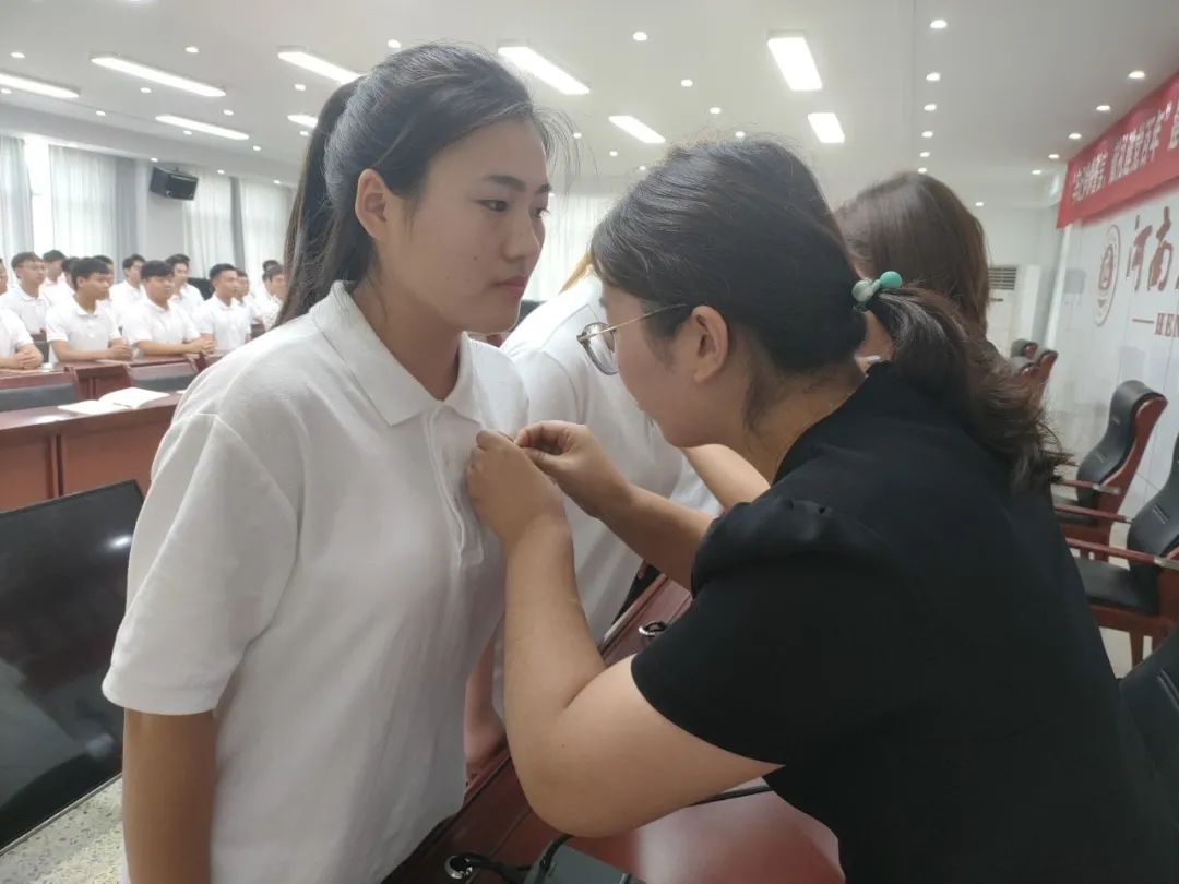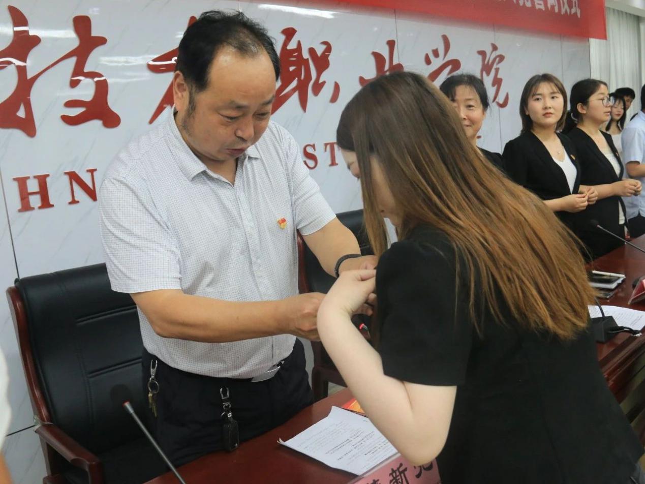 会议进行第二项,学校党委委员薄新党带领老党员们为新党员佩戴党员徽章,并为新党员发放《中国共产党章程》。