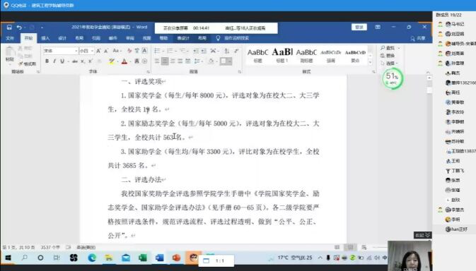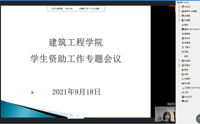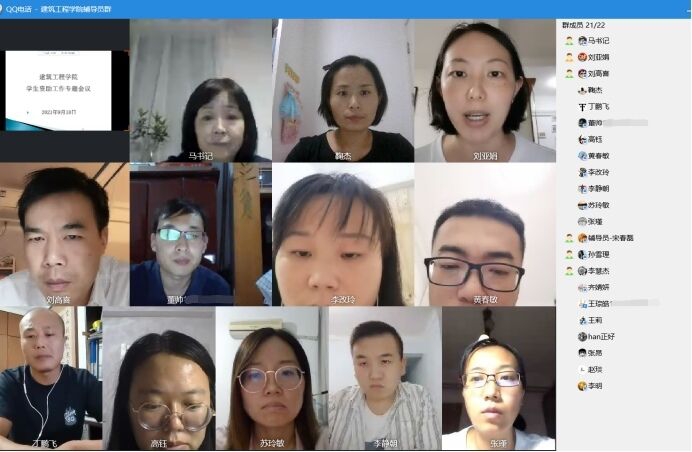 为了做好2021年国家奖助学金和评先评优等工作,按照学校工作要求,2021年9月18日,建筑工程学院召开了2021-2022学年学生资助工作专题会议,学院19、20和21三个年级21名辅导员参加会议,会议由学院党总支书记马春燕主持。