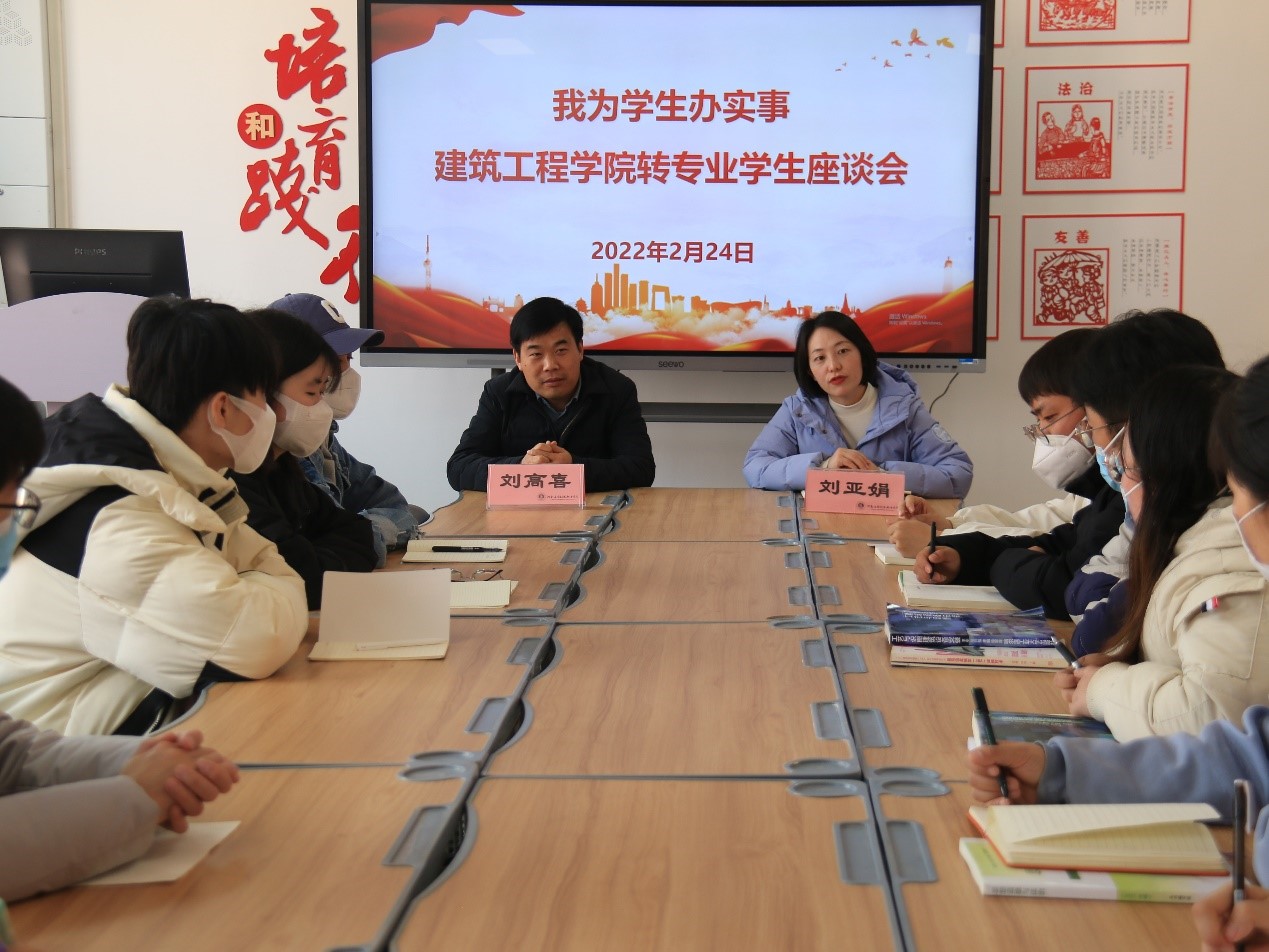 为了解2021级转专业同学进入学院后的学习生活情况,帮助学生解决实际困难,增强转专业学生对学院的认同感与归属感,提升学生凝聚力。2022年2月24日中午,建筑工程学院在办公楼516召开2021级转专业学生座谈会,学工办主任刘高喜,团总支书记刘亚娟,辅导员李慧杰及24名转专业学生参与会议。