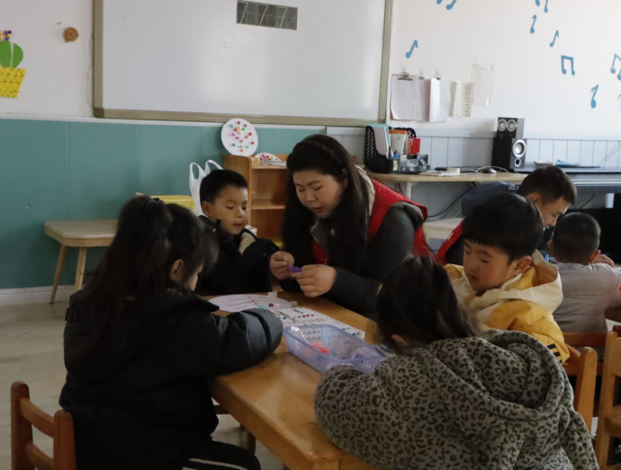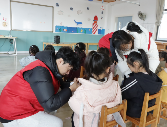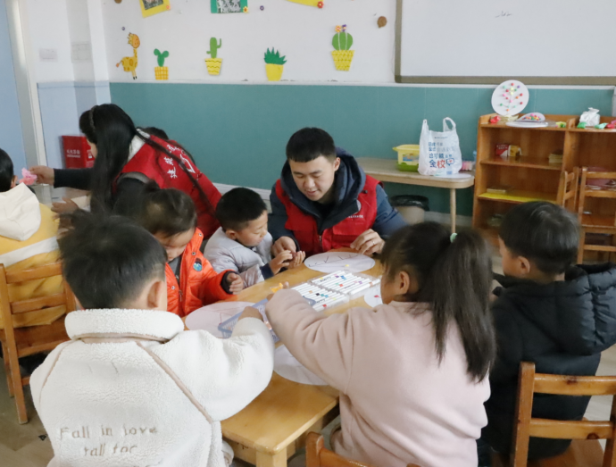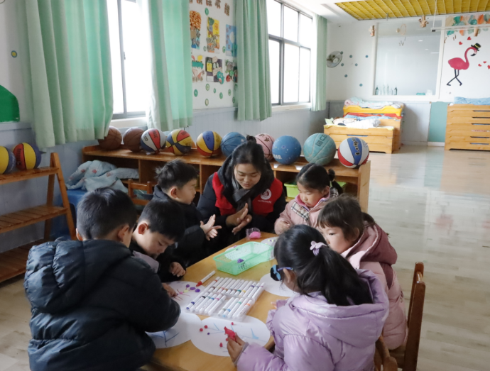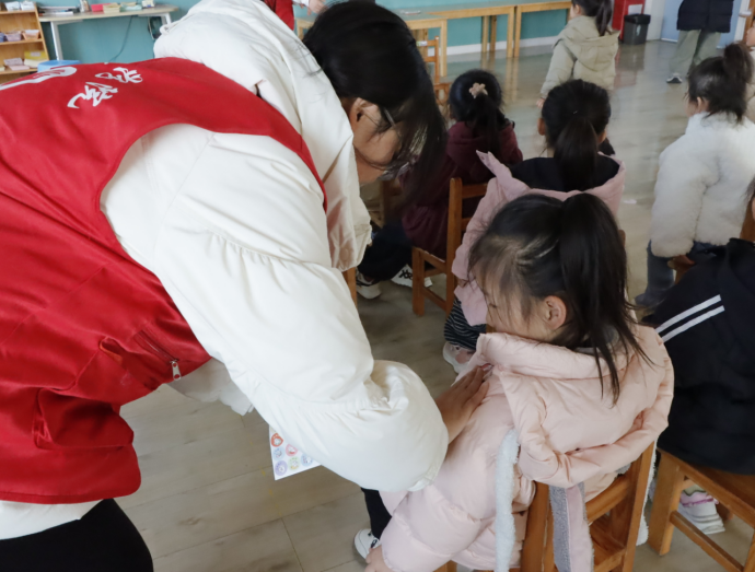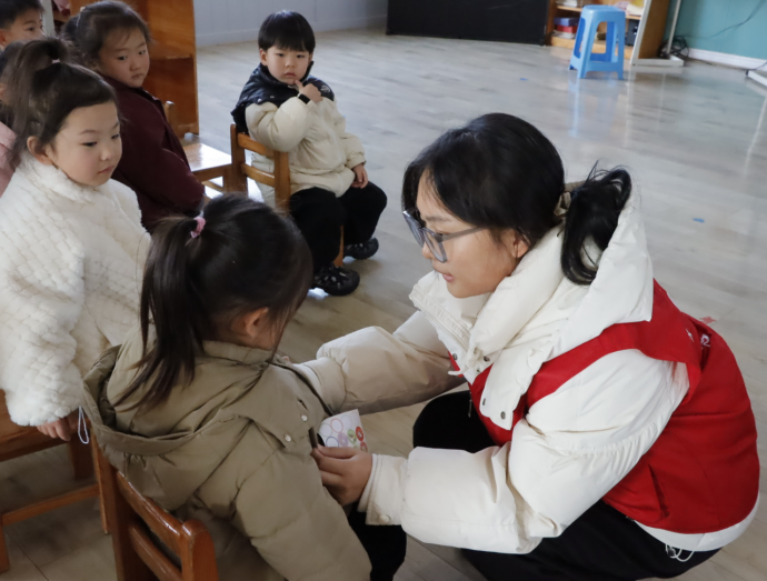 小筑志愿者们用活力驱散寒意,用巧思点亮童心,为幼儿园的小朋友们打造了一堂充满欢乐与温暖的趣味课堂,让志愿精神在冬日的校园里熠熠生辉。舞蹈教学时,小筑志愿者们将《红山果》欢快的旋律拆解成简单易懂的舞步,小筑志愿者会弯腰手把手指导,逐句引导孩子们学唱伴舞,鼓励他们大胆舒展肢体并且收获了专属贴纸的鼓励,稚嫩的笑声伴着欢快的旋律在教室回荡。