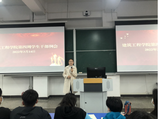 为提高学生干部的积极性及学生干部的工作效率,2022年3月14日中午,建筑工程学院在郑州校区B102教室召开了第四周学生干部例会,学工办主任刘高喜、团总支书记刘亚娟、辅导员李慧杰参与此次会议。