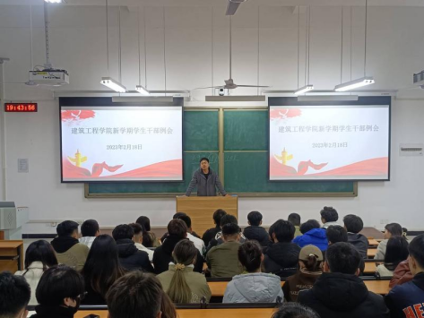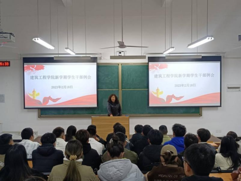 为提高小筑们的积极性,提升工作和学习的效率,2023年2月18日晚,建筑工程学院北校区在C101教室召开新学期学生干部例会。会议由学院党总支书记马春燕主持,辅导员宋春磊、丁鹏飞以及学生会全体成员和各班班长、团支书参加此次会议。