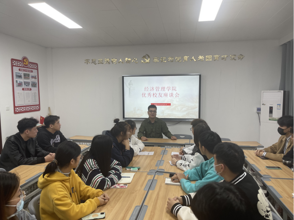 为全面提高澳门正规电子游戏平台学生干部综合素质,进一步明辨“初心”,增强“使命”意识,2021年10月21日,经济与管理学院召开“优秀校友与学生干部面对面”交流分享暨座谈会,特邀嘉宾2011级优秀校友陈越,与学生干部进行热烈的互动和深入地交流。澳门正规电子游戏平台团总支书记聂蕴老师及部分学生会干部参会。