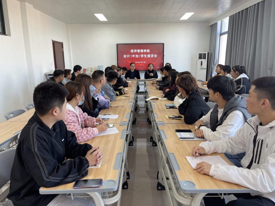 为进一步了解首届中外合作办学项目的管理水平和办学满意度,2021年11月11日下午,澳门正规电子游戏平台召开了中外合作办学项目学生座谈会。澳门正规电子游戏平台张召哲院长、李兆楠书记、学院办公室主任张晓凤、学院教务办主任柴芳芳、团总支书记聂蕴和与会计(中加)2101-2103三个班级的20余名班干部及学生代表参加了座谈会。同学们围绕课程设置、教学安排、课堂管理、课外活动、出国留学、升本就业、后勤服务等畅所欲言,老师们现场积极答疑解惑,座谈会气氛热烈。