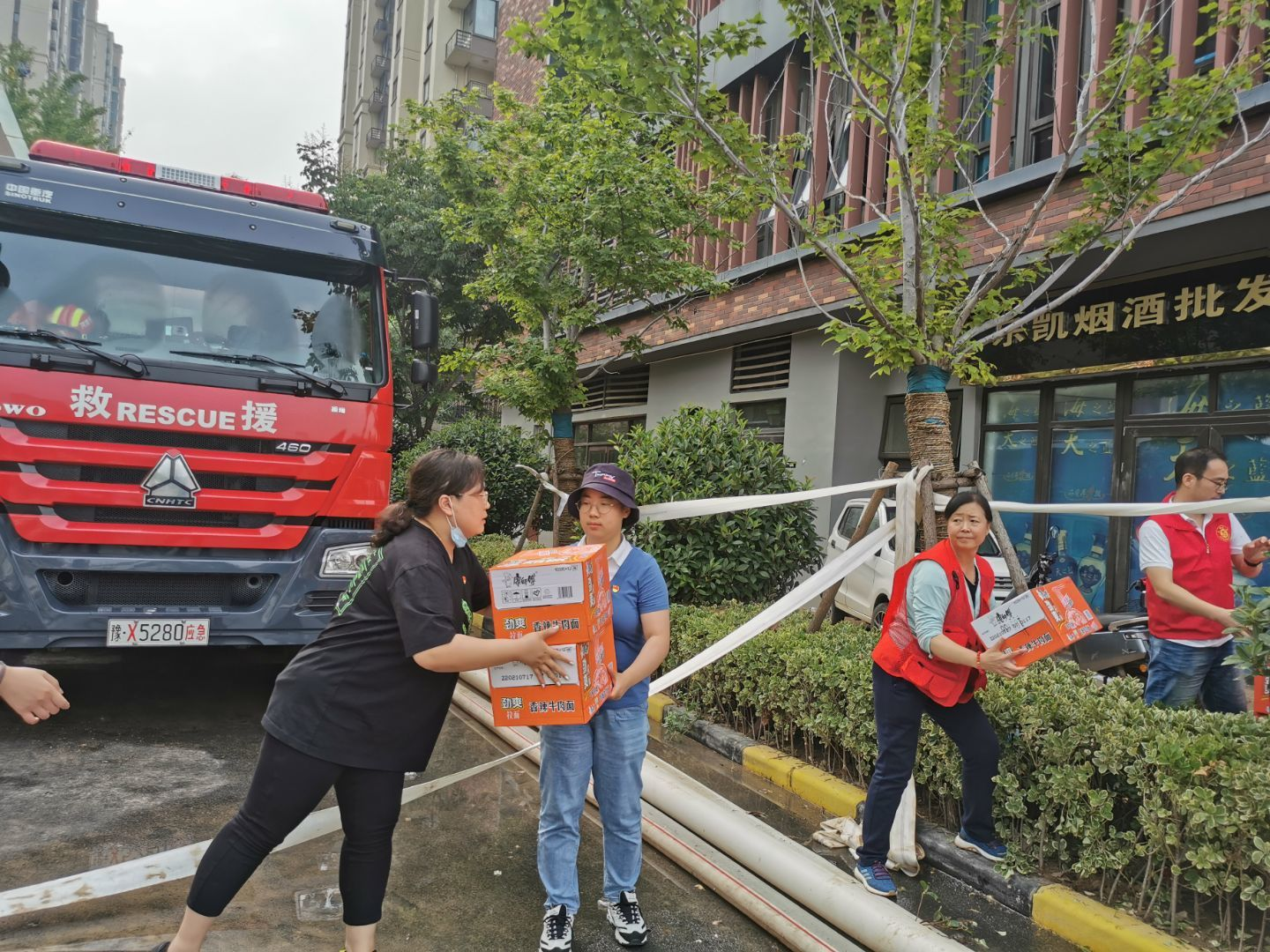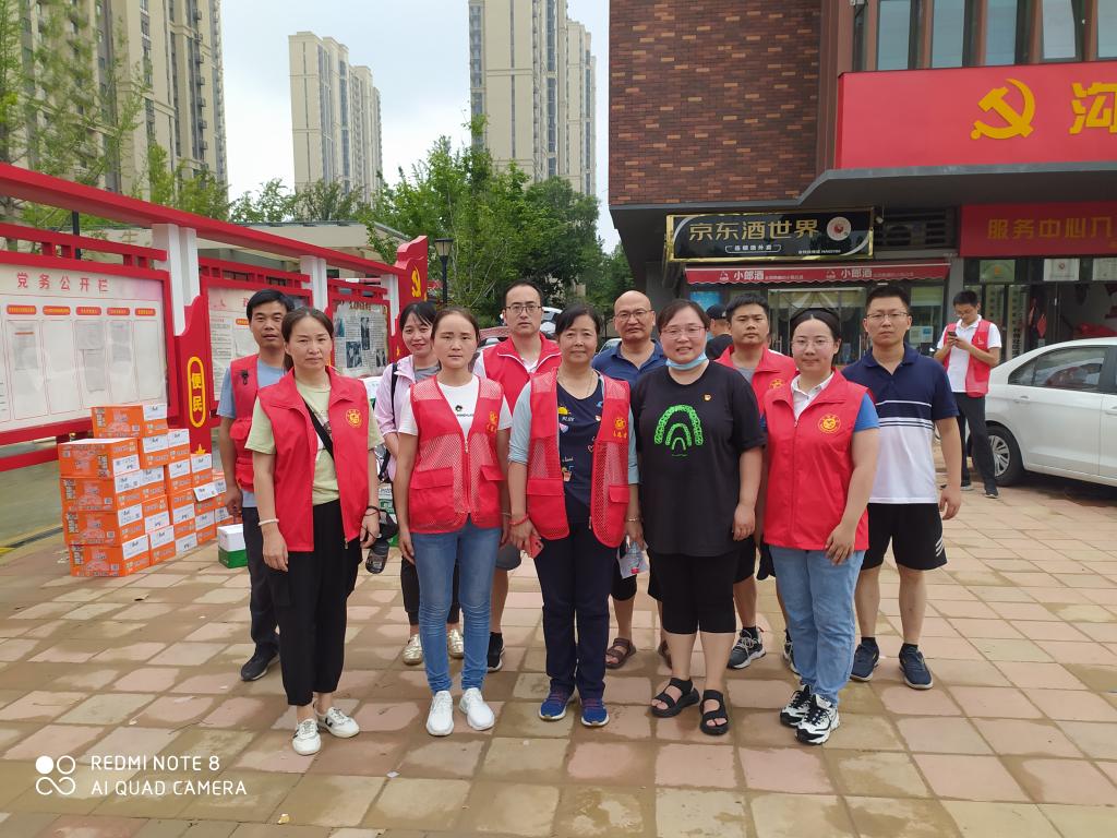 该小区内都是高层楼房,由于地下室被淹,造成停水停电,有很多是困在家里无人照顾的老人、小孩及孕妇,现急需把救灾物资徒步运送上楼。党员教师们毫不犹豫的扛起物资,从1楼到34楼挨家挨户进行分发,当受灾群众打开门看到浑身湿透、气喘吁吁的志愿者们,他们非常的感动,没想到来得这么快,真及时,口中表达真诚的感谢。经过半天的努力,所有物资全部分发完毕。