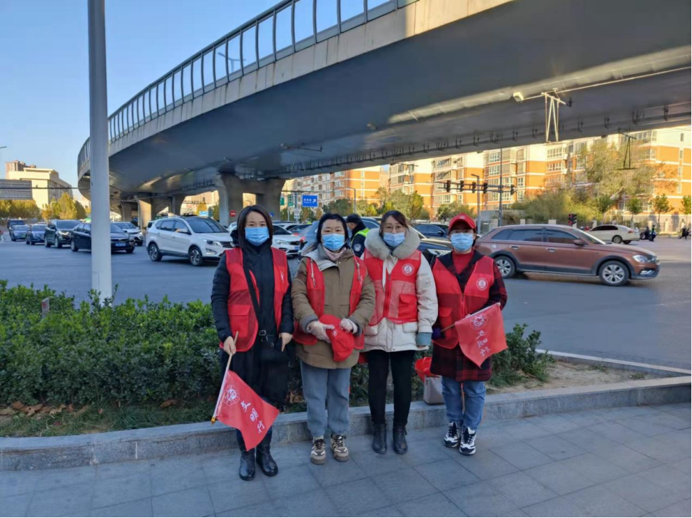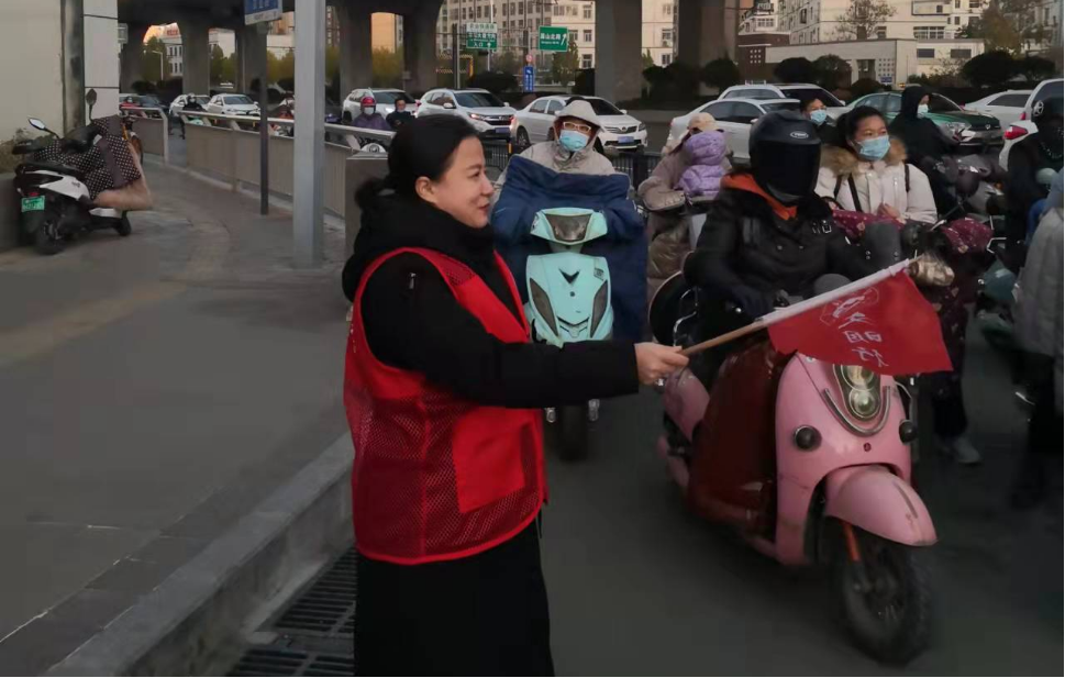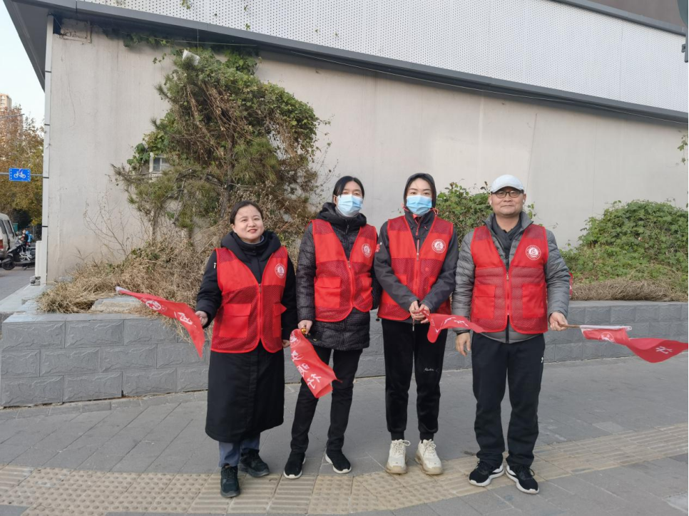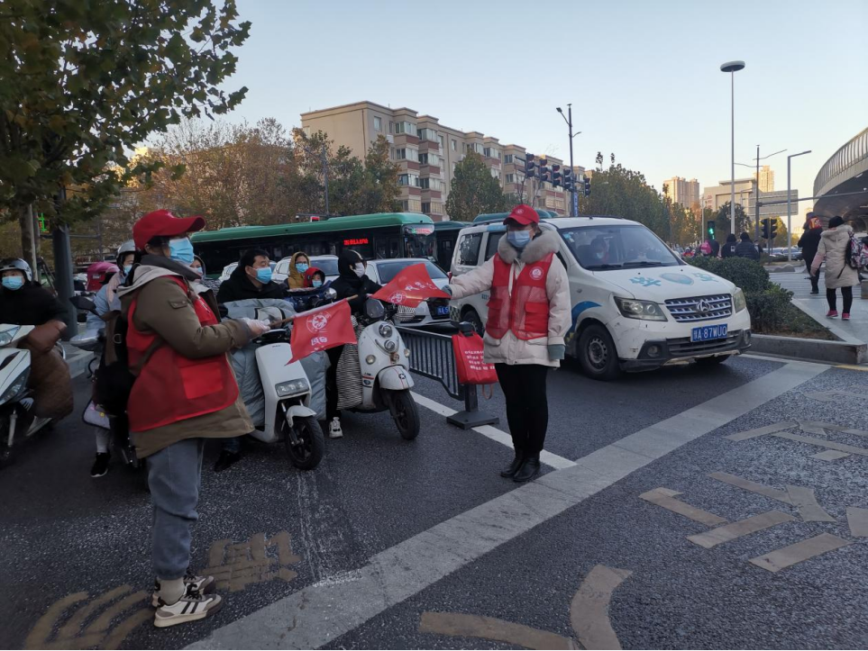 为了给市民出行营造畅通、文明的交通环境,2021年11月30日,澳门正规电子游戏平台范红梅、关杰、柴芳芳、何晓升、朱冠颖、赵静、刘蕊、刘迎荷八位老师组成两支志愿者队伍,走上街头向群众宣传文明出行理念,引导市民文明出行。志愿者们到达农业路桐柏路路口后,分成四个小组,分散在每个路口,手持交通引导旗,对行人和非机动车遵守交通规则进行引导。