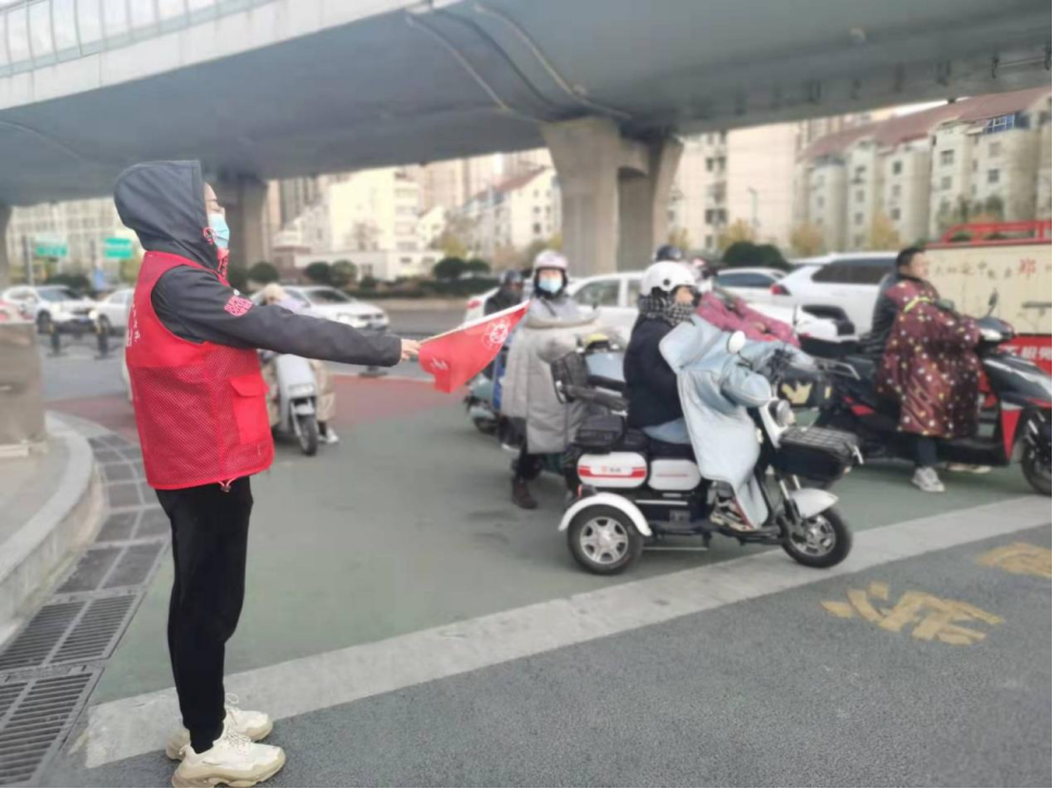 在活动中,志愿者在指定路口,拿小红旗站岗,劝导群众不闯红灯,不乱穿马路;对非机动车闯红灯,占用斑马线等不文明行为及时上前劝阻,并告知其不文明行为所带来的危害。