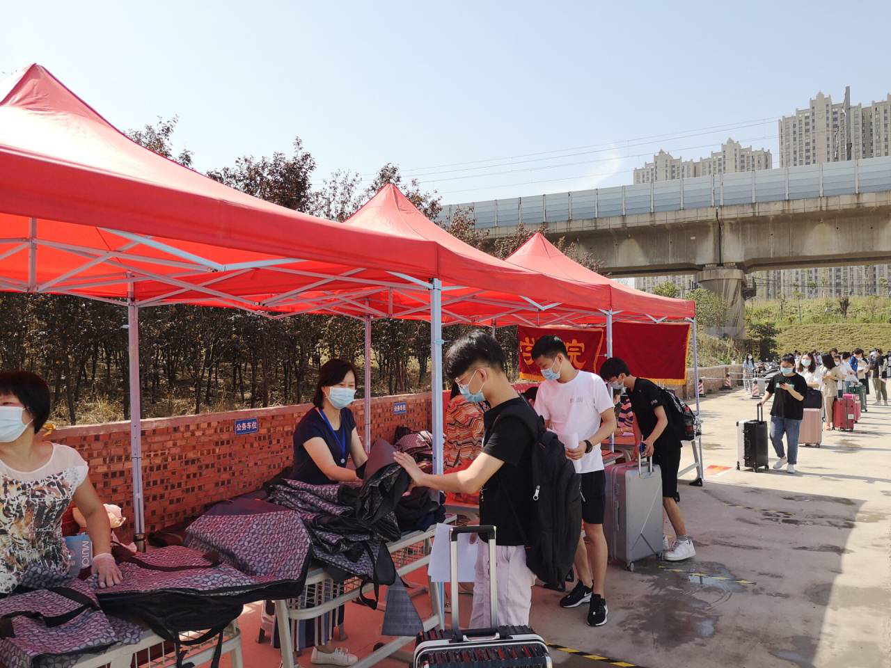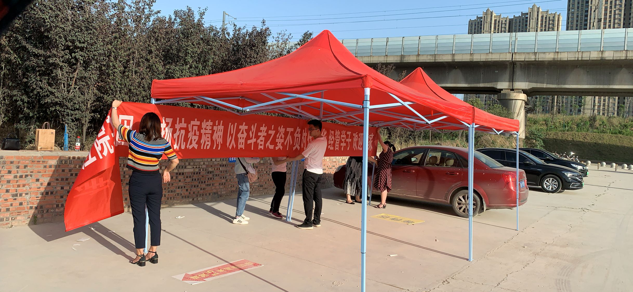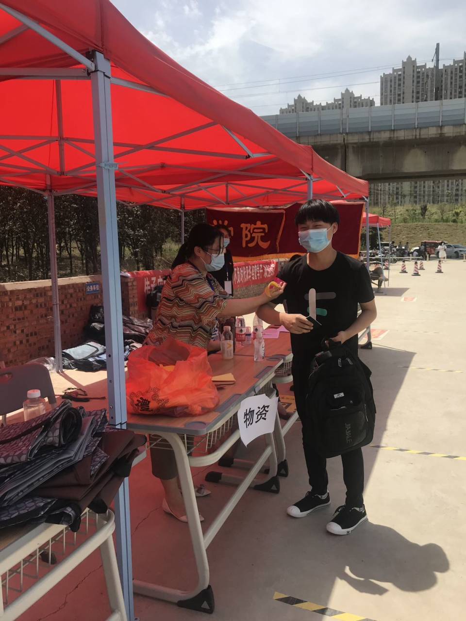 早上6:00,全体党员在学校南门集合完毕,党总支书记李兆楠同志作动员讲话。她指出一名党员就是一面旗帜,在此次主题党日活动中,大家要主动亮身份、当先锋,为返校实习学生打通“最后一公里”,为学校整体安全保驾护航。随后,全体党员老师就在学生返校实习报到点搭起了帐篷,设立了党员服务点,备齐了相关物品。服务点搭起后,全体党员以支部为小组,在指定的接待点,引导返校学生有序排队,进行体温检测、行李消毒、绿码查验、身份核实。进校后,到宿舍辅导员老师处报到办理相关手续,后党员教师利用电瓶车、手推车、三轮车等工具将学生的行李、物品搬运出宿舍。大家用热情周到的服务,不仅让返校学生感受到温暖,也为健康校园筑起安全防线。