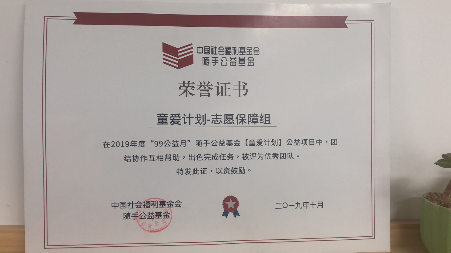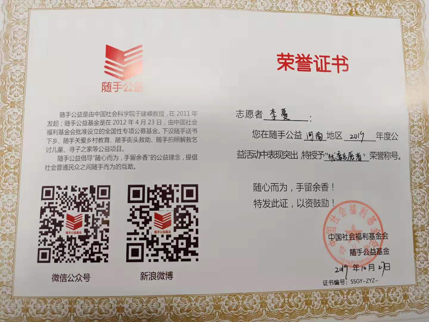 2019年10月27日,由中国福利基金会“随手公益”基金组织举办的“99童爱计划”颁奖典礼在郑州市千玺广场大厦举办,澳门正规电子游戏平台党总支学生党支部志愿服务团队应邀参加颁奖典礼。