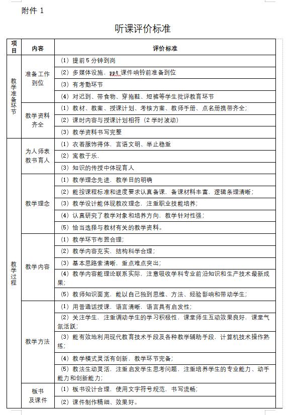 1.院长、副高级及以上职称教师、教学办主任、教研室主任、每学期按组别听课,填写附件1听课评价标准;