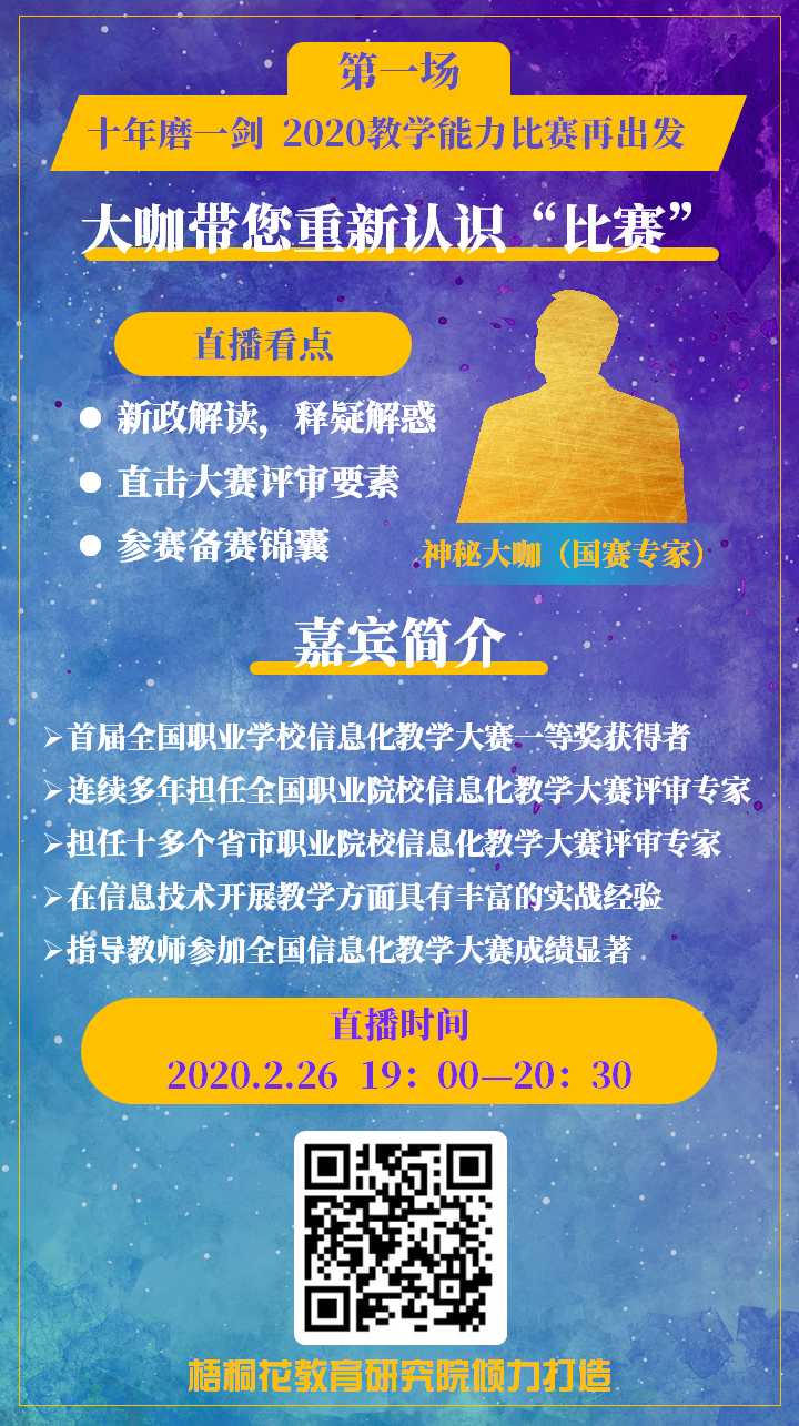 当前,新型冠状病毒感染的肺炎疫情防控工作到了最吃劲的关键阶段,要毫不放松做好疫情防控重点工作,确保“停课不停学,教学不断线”。为了贯彻电子游戏防控疫情工作领导小组的有关部署,落实疫情防控期间利用互联网和信息化教育资源为学生提供学习支持的具体要求,帮助教师更好掌握“互联网+教学”的基本技能,同时为2020年教学能力大赛做准备,按照学校安排,澳门正规电子游戏平台组织全体专兼职教师于2月26日-27日每天晚上19:00-20:30在线观看学习教学能力比赛系列直播。