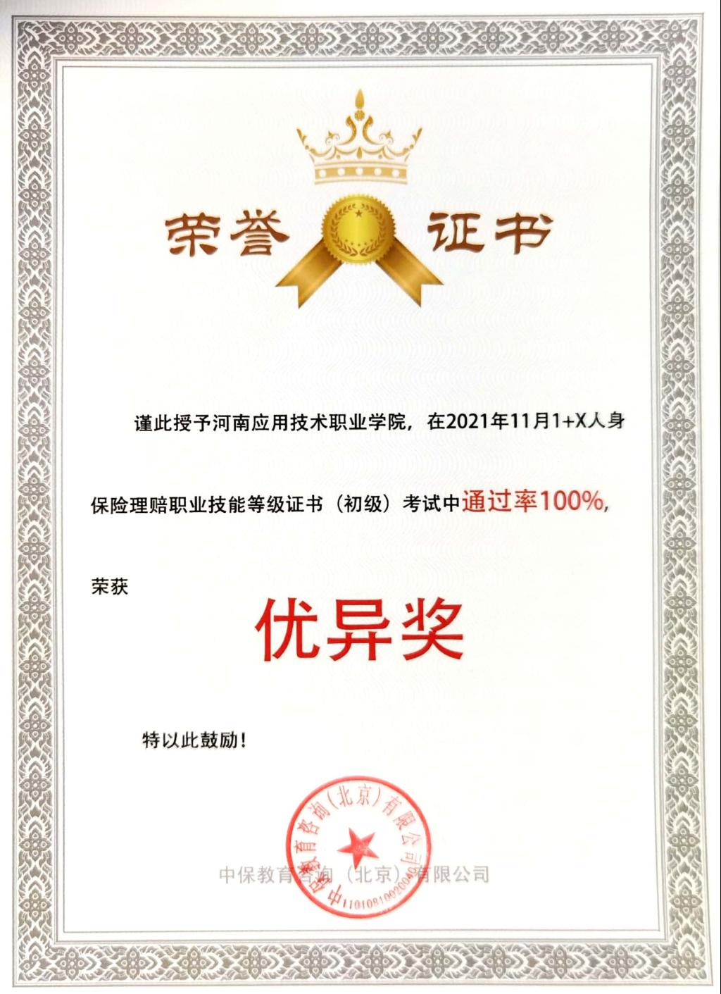 电子游戏作为河南省“1+X”人身保险理赔职业技能等级证书试点院校,澳门正规电子游戏平台全体教师不仅利用课上时间开展培训,而且还利用课下及周末的时间激进型线上线下辅导,多次组织金融服务与管理专业学生进行模式考试,通过3个月师生的共同努力,最终在11月13日上午的初级考试中取得获证率100%的好成绩,并荣获优异奖。同时,澳门正规电子游戏平台赵静老师、刘丹花老师获得“1+X”人身保险理赔职业技能等级证书的优秀辅导教师。