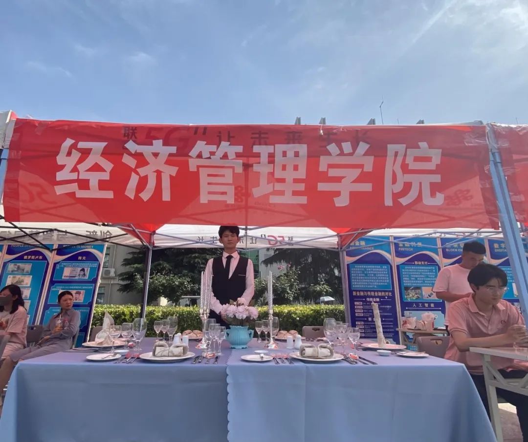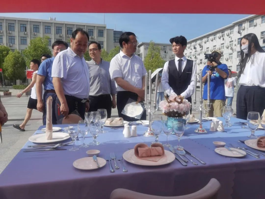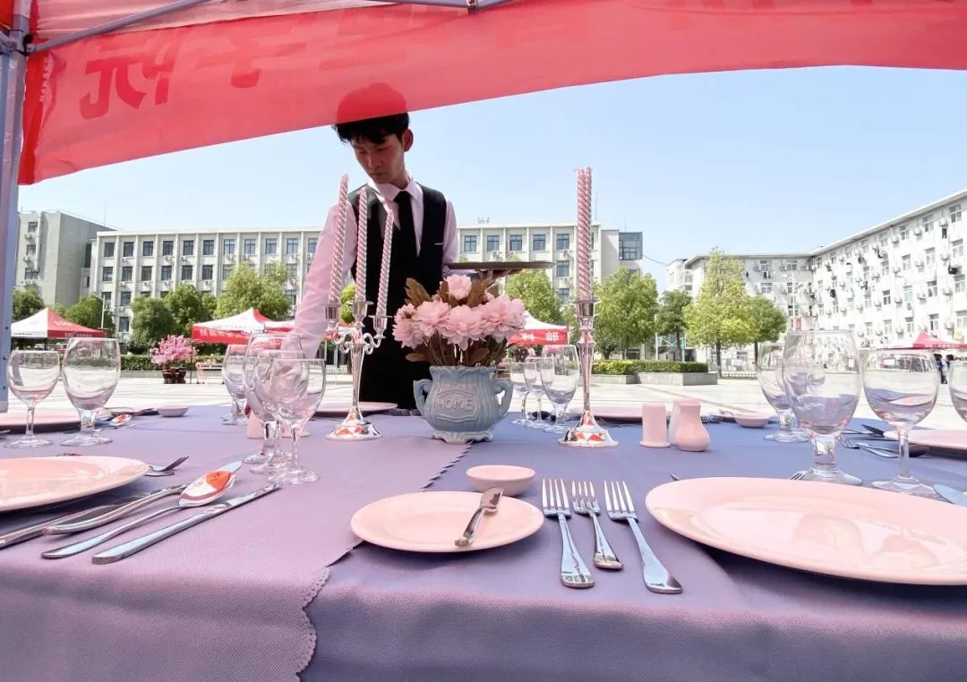 为展示酒店管理专业学生专业风采,增强专业自信,在2023年职业教育活动周期间,澳门正规电子游戏平台在郑州校区北广场进行酒店管理专业“西餐宴会摆台”展示活动。