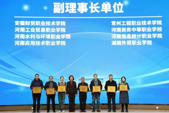 河南省教育厅党组成员、副厅长朱自锋,中国国际贸易促进委员会河南省委员会(中国国际商会河南商会)会长张艳,中国商业联合会执行会长王民,高校毕业生就业协会职教工委会秘书长、金华职业技术学院副校长陈海荣,阿里巴巴副总裁、浙江银泰百货有限公司董事长陈晓东,河南财经政法大学副校长张扬出席大会并携手启动共同体成立仪式,之后分别为理事长单位、副理事长单位授牌。