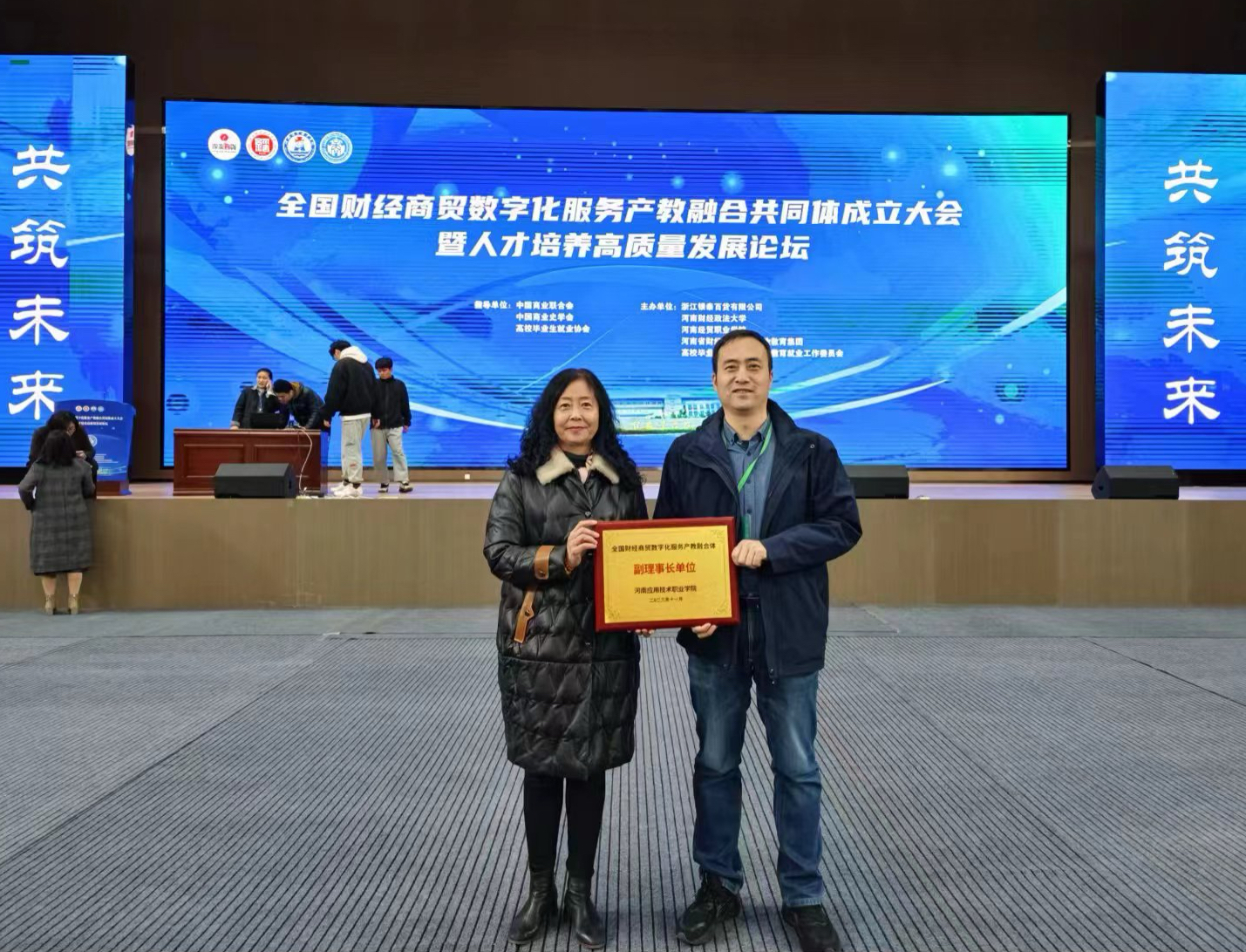 11月25日,全国财经商贸数字化服务产教融合共同体成立大会暨人才培养高质量发展论坛在河南经贸职业学院大学生活动中心举行。来自省内外的兄弟院校代表、企业代表、行业组织和科研机构代表共150多家单位,400余人参加了大会。学校校企合作与就业处处长马春燕、澳门正规电子游戏平台院长张召哲作为副理事长单位代表受邀参加大会。
