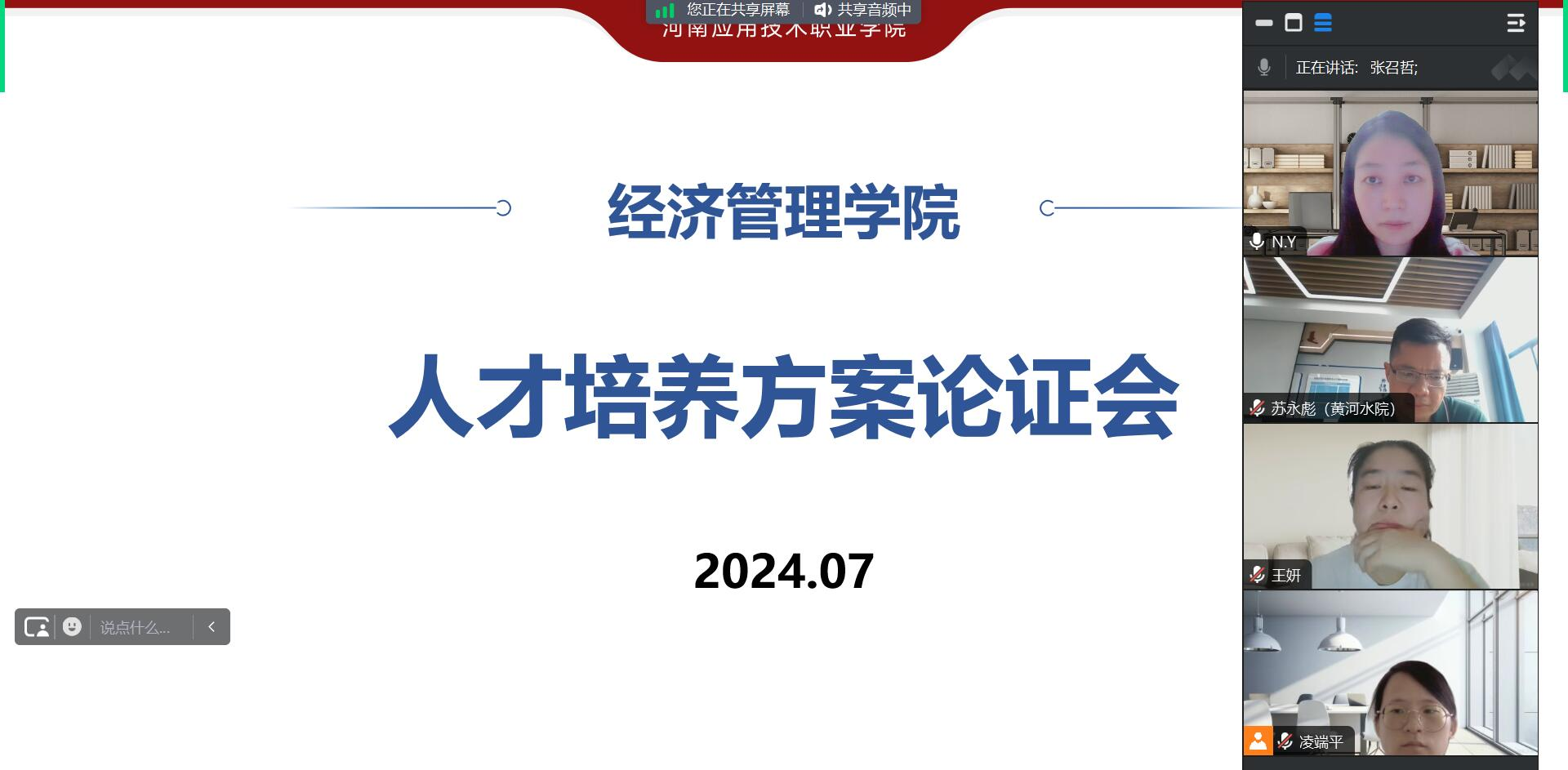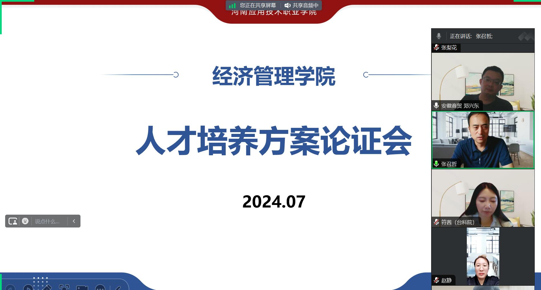 为进一步提高人才培养方案编制工作的科学性和规范性,构建与学校发展目标相适应的人才培养体系,做好人才培养的顶层设计,切实提高人才培养质量。7月初,澳门正规电子游戏平台就启动了2024级人才培养方案修订工作。7月27日学院邀请省内外院校及行业企业专家开展了人才培养方案专家论证会,对澳门正规电子游戏平台五个专业的人才培养方案分组开展论证。来自深圳职业技术大学、台州科技职业学院、黄河水利职业技术学院、安徽商贸职业技术学院、郑州旅游职业学院的校外专家教授以及浙江绿城集团、河南省那些人贸易有限公司的企业专家应邀参加论证。澳门正规电子游戏平台院长张召哲、教研室主任、专业负责人等相关人员参加了会议。论证会由学院副院长聂蕴主持。