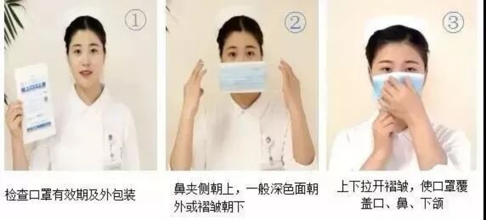 口罩佩戴时,要将折面完全展开,将嘴、鼻、下颌完全包住,然后压紧鼻夹,使口罩与面部完全贴合。戴口罩前应洗手,或者在戴口罩过程中避免手接触到口罩内侧面,减少口罩被污染的可能。