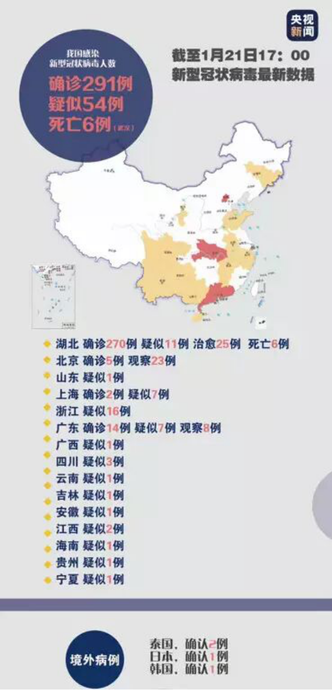 截至1月20日0-24时,国家卫生健康委收到国内4省(区、市)累计报告新型冠状病毒感染的肺炎确诊病例291例(湖北省270例,北京市5例,广东省14例,上海市2例);14省(区、市)累计报告疑似病例54例(湖北省11例,广东省7例,四川省3例,云南省1例,上海市7例,广西壮族自治区1例,山东省1例,吉林省1例,安徽省1例,浙江省16例,江西省2例,海南省1例,贵州省1例,宁夏回族自治区1例)。收到日本通报确诊病例1例,泰国通报确诊病例2例,韩国通报确诊病例1例。