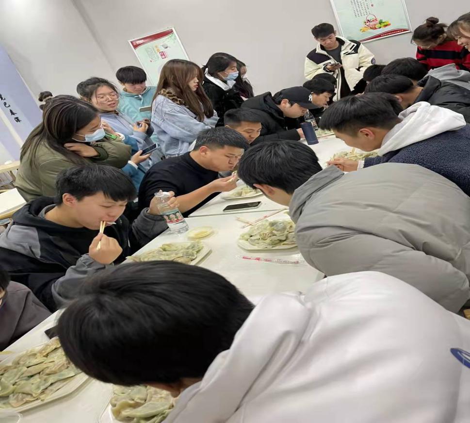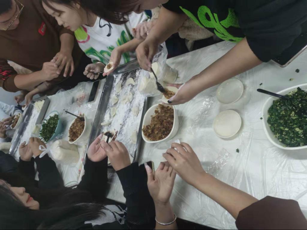 活动现场,三五人围成一圈,纷纷摩拳擦掌,跃跃欲试,现场热闹非凡。从准备馅料、和馅、包饺子、煮饺子大家都亲自参与,个个变成了“包饺子能手”,放肉馅、捏饺皮、摆造型,虽然包的手法不一,风格不同,包出来的饺子形态各异,但可以感受到大家享受在其中、沉浸在其中。活动过程中不时的开展包饺子比赛、吃饺子比赛,食堂内已然成为一个其乐融融的大家庭,讨论声、欢笑声交错进行,冬至的温暖与快乐充溢在每个人的心里,也包进了每一个玲珑可爱的饺子里。