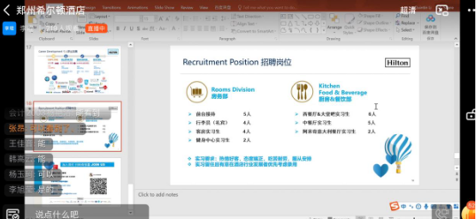为推进2024届毕业生顺利就业,继续实现“稳就业”目标,2023年3月14日,以钉钉会议形式,澳门正规电子游戏平台举办“职为你来”空中宣讲会。学工主任张昂“牵桥搭线”主持会议,郑州希尔顿酒店与同学们“隔空”相聚。