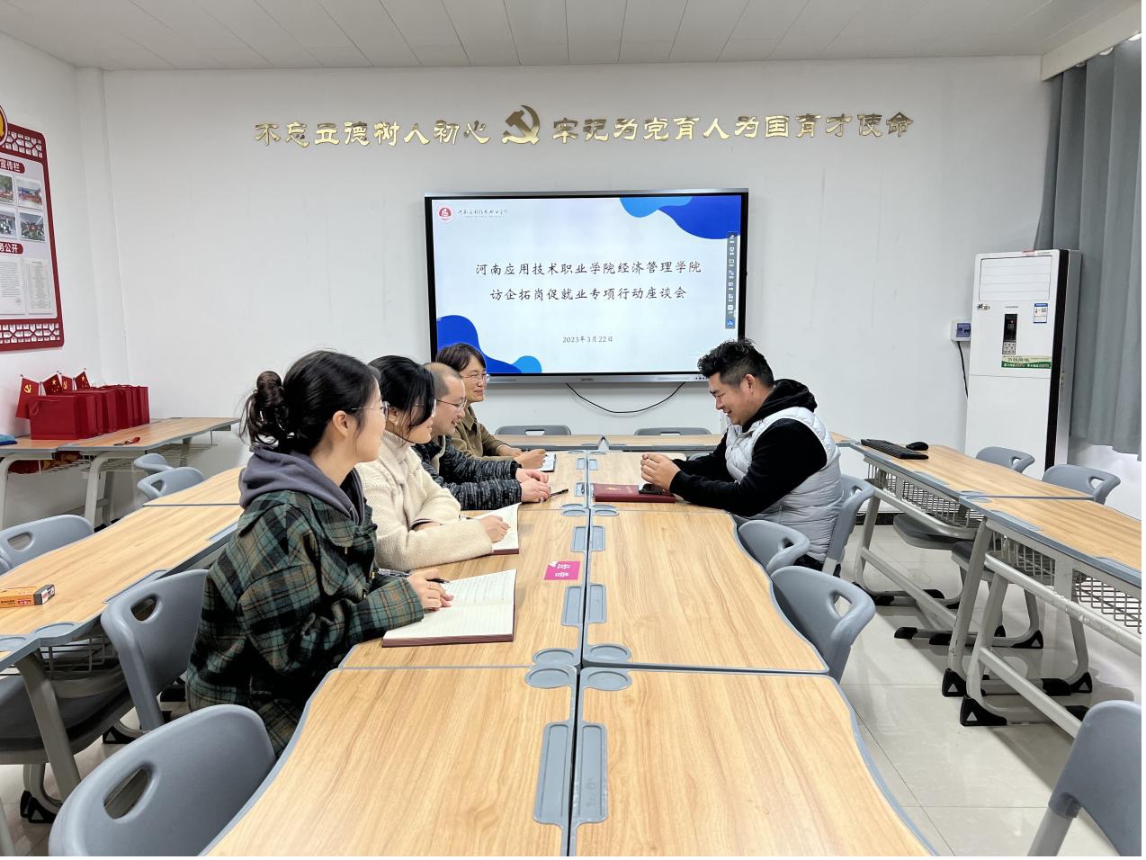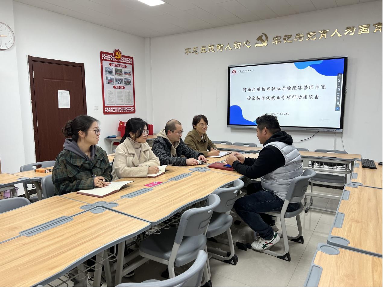 为深化校企合作交流,拓展毕业生就业渠道,3月22日,澳门正规电子游戏平台在A505开展访企拓岗促就业专项行动座谈会。河南沧海房地产营销策划有限公司总经理王世勇、校企合作与就业处副处长张万仑及相关教师出席座谈会。副书记王盼红主持会议。