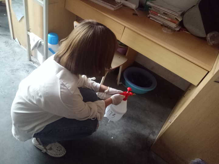二、消毒工作人员正在认真、仔细地消毒,不放过任何一个死角。消毒后关闭宿舍门窗半小时,半小时后开窗通风15分钟后方可进人。